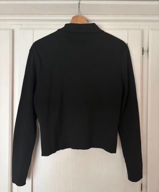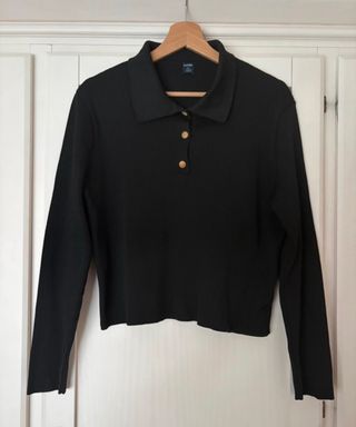 Jersey de manga larga con cuello polo y botones dorados,(mujer). - Tejido de canalé. - Diseño cropped. -Poliester- TALLA XL/42/14 Medidas hombros 43 cm,axila a axila 54 cm Es una talla XL ideal para la 46 segun la tabla de medidas