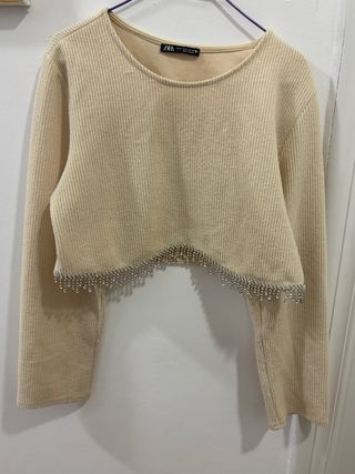 Jersey crop top de Zara con detalles de pedrería. - Manga larga acampanada. - Tejido de canalé. - Adorno de brillantes en el bajo.