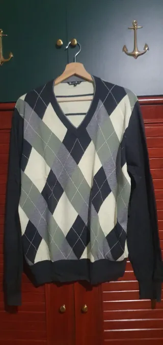 Jersey de punto con diseño de rombos en contraste. Ideal para un look casual o elegante. - Cuello en V. - Manga larga. - Puños y bajo elásticos.