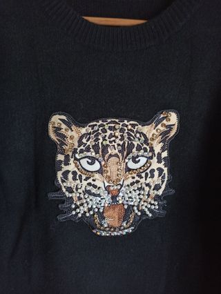 Elegante jersey negro con un llamativo diseño de tigre bordado en la parte delantera. Presenta mangas con diferentes estampados y colores. Elegante jersey negro de calidad #tigre nuevo talla única largo 70, sisa 63 sin estirar, de hombros tiene 58, y de largo de las mangas 47, mangas originales caídas, tigre con perlas y circonitas, composición: 52% acrílico, 10% viscosa y 38% poliamida, da talla, un fondo de armario en tendencia, elegante, a un super precio #jerseynegro #jerseytendencia #jer - Diseño de tigre con detalles bordados y pedrería. - Manga izquierda con estampado de cuadros. - Manga derecha con bloques de color y texto.