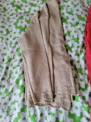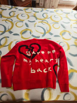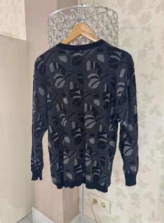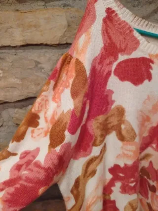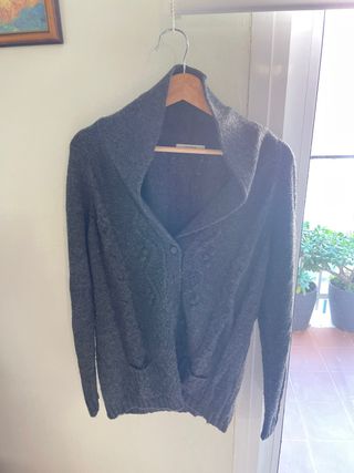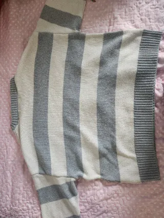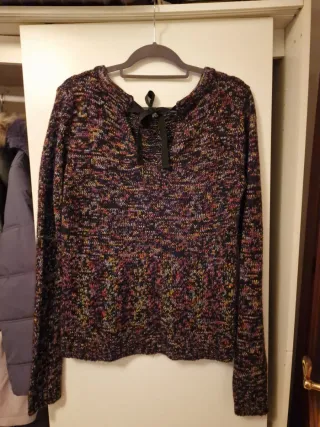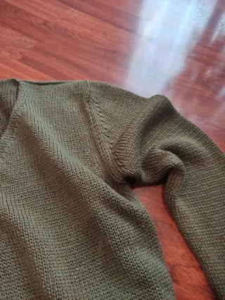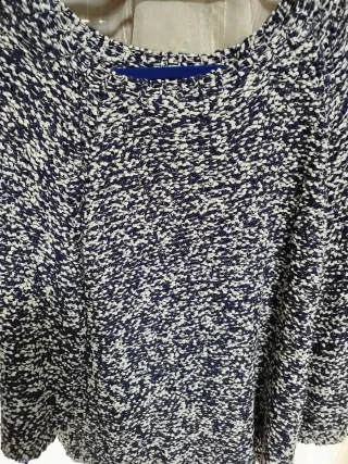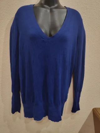 Jersey de punto fino para mujer. Es muy ancho es como una talla XL. Tiene bastante uso pero aún está bien. Tiro corto - Diseño de cuello en V. - Manga larga. - Tejido jaspeado.