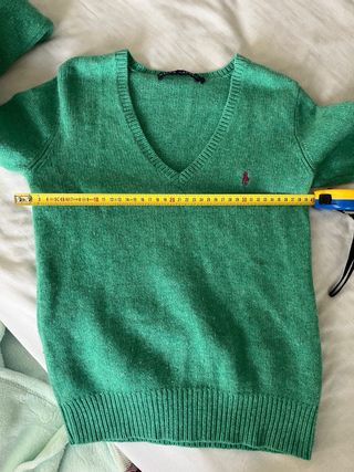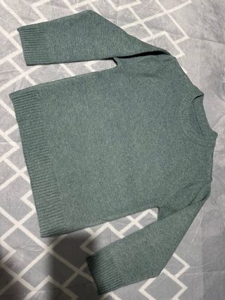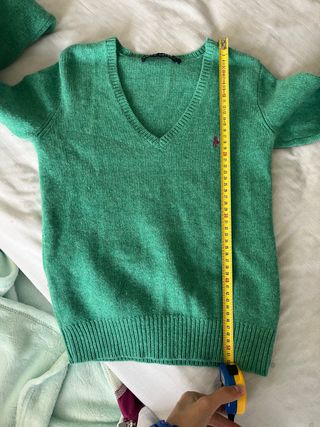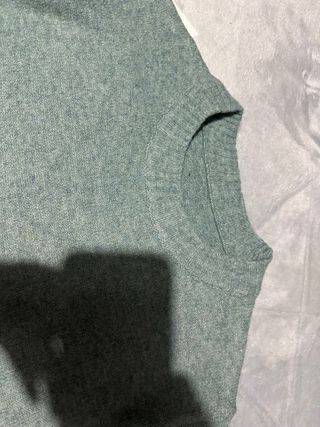 Jersey de punto fino en color verde agua, con detalle de botones decorativos en el hombro. - Cuello redondo. - Bajo con capa de tejido blanco tipo camisa. - Manga larga. Muy poco uso!!! Está en perfecto estado!!!