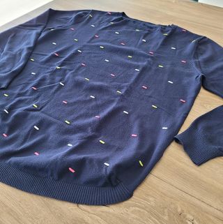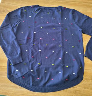 jersey mujer en viscosa/poliester, ligeramente elástico. color azul marino con bordados en colores en la parte delantera. Talla XL. ver medidas en las fotos