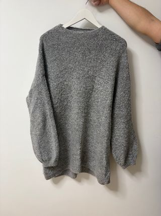 Jersey gris de H&M, con mangas acampanadas. Talla L. El jersey mide 58 cm de alto (del cuello a la cintura) x 47 cm de ancho. Las mangas miden 63 cm de largo (desde la costura del hombro al final del puño) x 18 cm de ancho (el puño). El jersey tiene una composición de 52% poliéster, 41% acrílico, 4% lana y 3% elastán.