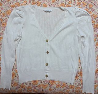 Jersey de punto fino con cuello en V y botones dorados. - Manga larga abullonada. - Tejido acanalado. - Cierre de botones delanteros.