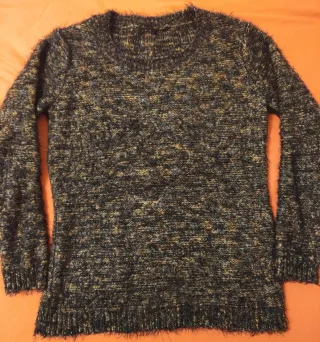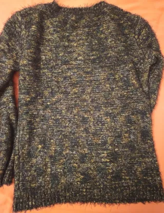 Jersey oversize de punto con diseño de rayas horizontales y detalles dorados. En muy buen estado. Es talla única, pero equivaldría a una L o XL (yo suelo usar la S y me queda bastante amplio), ideal para usar con leggins. Medidas: * Ancho (entre sisas y parte baja): 57 cm * Largo (desde el hombro): 61 cm * Largo manga (desde la costura, q empieza 12 cm por debajo del hombro): 47 cm. * Ancho del cuello: 29 cm Tiene el cuello muy ancho y las mangas caídas.