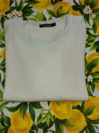 Jersey de punto en color crudo con un diseño encantador. Muy poco uso - Detalle de volantes en el cuello y los hombros. - Bordado floral en la zona del pecho y las mangas. - Tejido suave y cómodo.