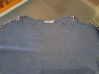 Jersey fino de cuello redondo con un diseño moderno. - Detalle de adornos en las mangas. - Parte de abajo redondeado. - Dos bolsillos frontales. - Corte ancho y largo.