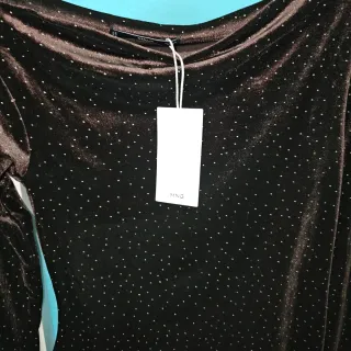 Elegante jersey de terciopelo suave en tono marrón chocolate, decorado con micro-strass brillantes, que aportan un toque glam a cualquier look. Diseño con cuello asimétrico. Tejido elástico, cómodo y favorecedor. Perfecto para fiestas, cenas o looks de noche. ●MEDIDAS 📏 📐 ● SISA 41 CM ● CINTURA 36-37 CM ● COMPOSICIÓN 🧵🪡 ● 93% POLIESTER ● 7% ELASTANO #Mango #JerseyMango #JerseyTerciopelo #TerciopeloMarrón #MarrónChocolate #JerseyStrass #CuelloAsimétrico #LookDeFiesta #OutfitNoche #Brillo #Amparoypunto