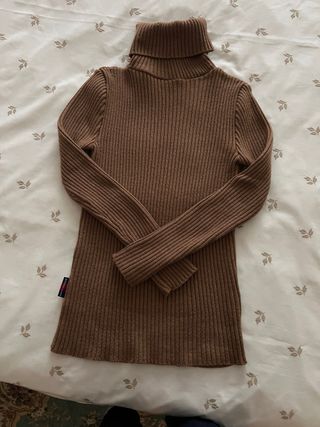 Jersey de cuello alto con un tejido acanalado muy agradable al tacto. Su color marrón lo hace versátil y fácil de combinar. - Diseño de cuello alto. - Tejido acanalado. - Manga larga.