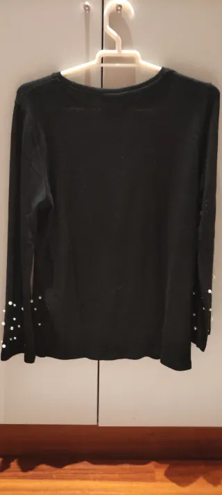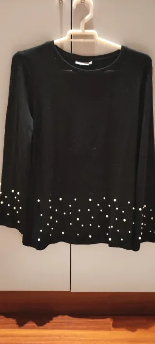 Elegante jersey negro con un detalle de perlas en el bajo. - Diseño con manga larga. - Adorno de perlas distribuidas en la parte inferior.