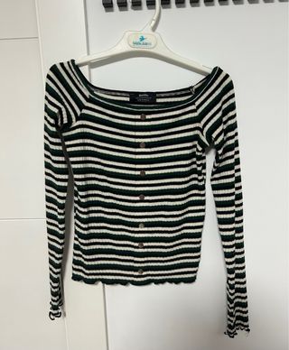 Jersey de manga larga con cuello Bardot y estampado de rayas. - Diseño ajustado. - Detalle de botones en la parte delantera. - Acabado festoneado en puños y bajo.
