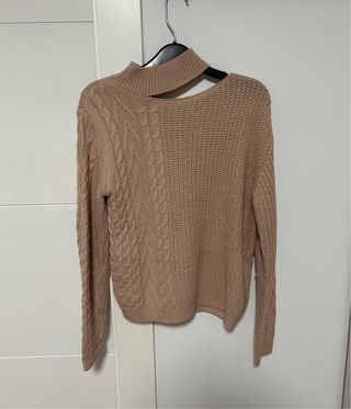 Jersey de punto en color beige, con un diseño moderno y elegante. - Cuello alto con detalle de abertura. - Tejido de punto trenzado en un lado. - Manga larga.