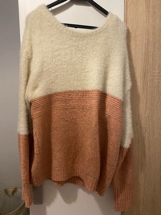 Jersey de punto suave con diseño bicolor. - Tejido mullido y agradable al tacto. - Parte superior en color blanco roto. - Parte inferior en tono rosa salmón.