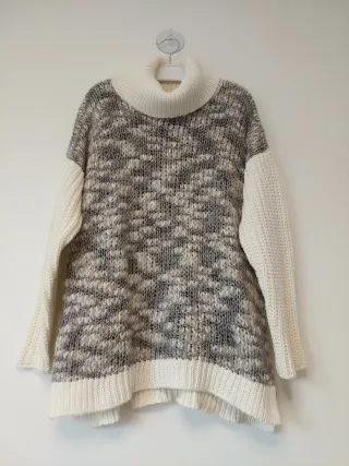 Jersey jaspeado con cuello alto acanalado y mangas de canalé de punto grueso. Talla XL estilo oversize. Medidas: axilas 54 cm; cintura 62 cm; largo 60 cm; cuello 20 cm.