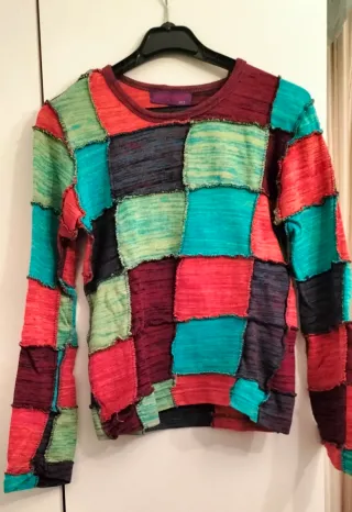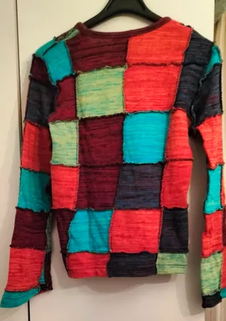 Jersey de manga larga con un diseño patchwork vibrante y colorido. Su estilo se inspira en la moda hippie, con parches de diferentes texturas y tonos. - Diseño de parches cuadrados. - Acabado con costuras visibles. - Cuello redondo.