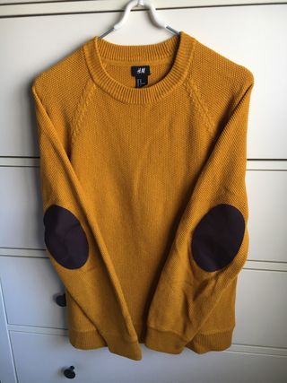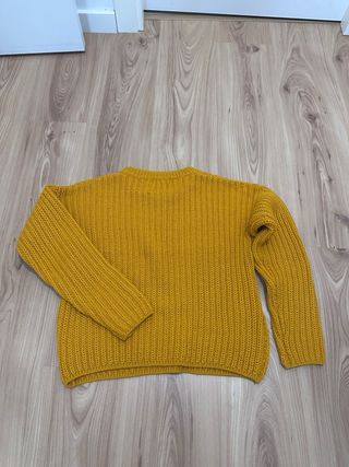 Jersey de punto con un bonito color mostaza y textura waffle. - Cuello redondo. - Coderas. - Manga larga. - Puños y bajo elásticos. Es una M pero gasto L y queda bien. Casi sin uso.