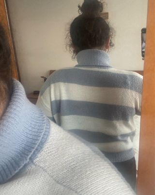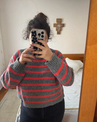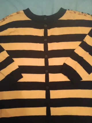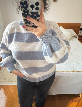 Jersey de pelo con un diseño de rayas en tres colores. Es muy suave y calentito. - Diseño de rayas horizontales. - Tacto muy agradable. - Corte holgado. No tiene talla, yo llevo la Xs, estaría entre la S y la M.