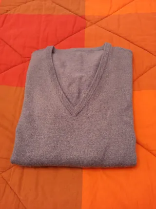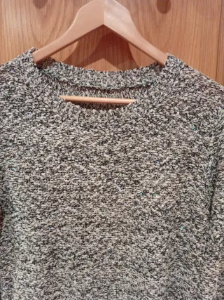 Jersey de punto gris. - Cuello en V. - Cinturón con hebilla. - Puños y bajo acanalados. Lo he usado 2 veces, está en perfectas condiciones, talla un pelín grande, sería una S-M.