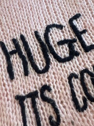 Jersey de punto abierto con mensaje. - Diseño de punto calado. - Mensaje HUGE ME ITS COLD bordado en negro. - Manga larga y cuello redondo. - Es muy suavito, color rosa bebé con letras bordadas en lana negra.