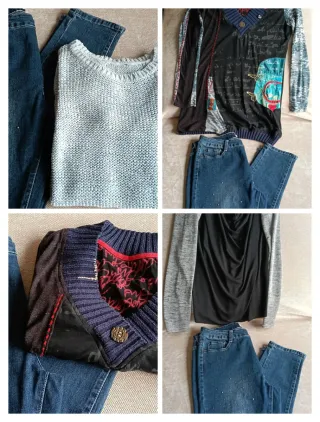 Conjunto de 4 prendas de ropa, ideal para renovar tu armario. - Un pantalón vaquero. - Dos camisetas. - Un jersey largo - Colores variados en azul y gris.