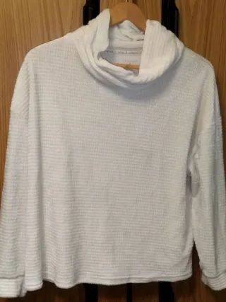Jersey Primark original de color blanco/crudo, ideal para el invierno o para estar cómoda en casa. Es una prenda estilo suéter con cuello alto tipo "cowl neck" y un tejido texturizado muy suave y cálido. Estado: Muy bueno (poco uso). Talla: M (corresponde a una 40-42). Marca: Primark (colección "relax & unwind"). Detalles: Tejido con relieve de gofre, corte cómodo y relajado.