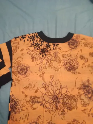 Jersey de mujer con un bonito estampado floral. - Diseño con flores en tonos marrones y naranjas. - Cuello redondo. - Mangas con rayas negras.