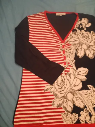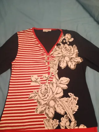 Jersey de mujer con un diseño original que combina rayas y flores. - Manga larga. - Escote en V con detalle de botones. - Combinación de estampado de rayas rojas y blancas con estampado floral en negro y blanco.