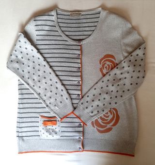 Conjunto de jersey manga corta y chaqueta manga larga con hombreras de la firma Olga Santoni. Color gris con detalles en naranja. Estampado combinado en rayas, lunares y flores. 45 cm de hombro a hombro. 65 cm de largo.