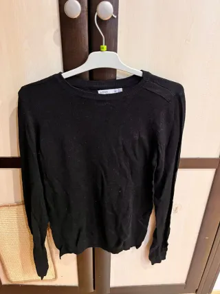 Jersey negro con detalle de lentejuelas en las mangas. - Diseño moderno y llamativo. - Manga larga. - Cuello redondo. Usado una vez , la lentejuelas están cocidas de forma sencilla. Se ha caído alguna, pero no se nota. Es talla única viene ser una M-L