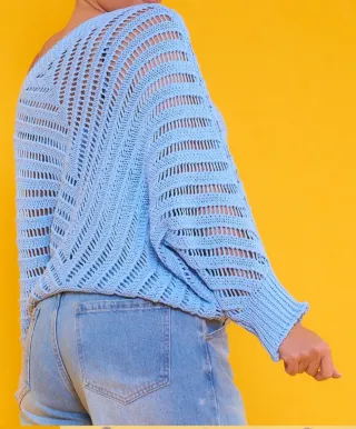 Jersey de punto calado con un diseño elástico y moderno. Su tejido ligero lo hace perfecto para cualquier ocasión. - Un jersey calado elástico que tiene manga murciélago Tiene un corte asimétrico, teniendo dos picos que cuelgan de los laterales. - Diseño de punto calado. - Tejido elástico. - Manga larga.