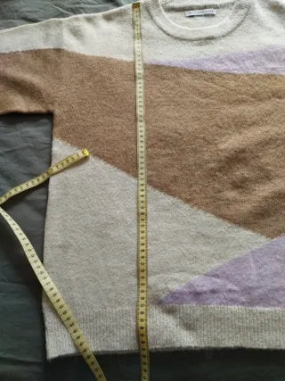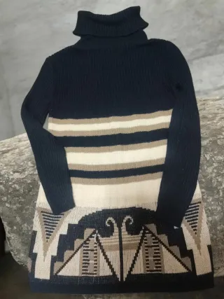 Jersey largo con un diseño de rayas y estampado geométrico en la parte inferior. - Cuello alto estilo cuello de cisne. - Mangas largas. - Tejido de punto. - Un pequeño hilo suelto,apenas se aprecia
