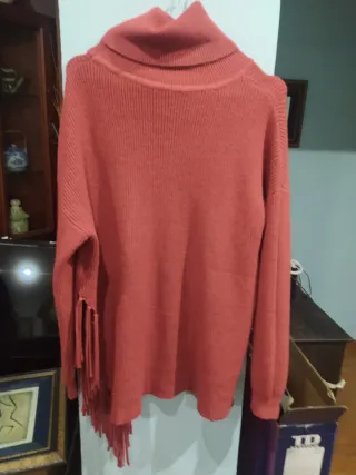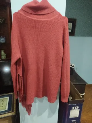 Jersey de punto con un diseño llamativo y moderno. - Estampado étnico en tonos marrones y beige. - Cuello redondo y mangas largas. - Detalle de flecos en el bajo. Usado , alguna bolita,pero queda precios igualmente.