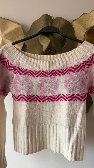 Precioso jersey de la marca Brownie con un diseño Fair Isle en tonos rosa y blanco. Es una prenda muy cómoda y con un estampado llamativo. - Diseño Fair Isle. - Cuello redondo. - Manga larga.
