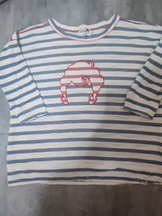 Jersey de manga al codo con un diseño de rayas azules y blancas. Presenta un estampado frontal de un peinado en rojo. Bajo con un toque deshilachado. - Cuello redondo. - Puños y bajo con acabado. - Tejido texturizado.