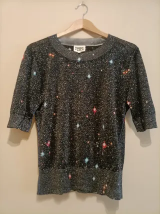 Jersey de manga corta con un diseño espacial. - Estampado de estrellas y galaxias. - Tejido brillante y ligero. - Etiqueta interior cortada