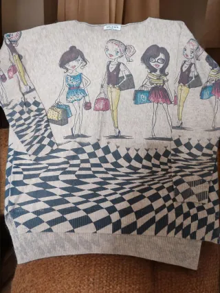 Jersey fino con un estampado divertido de chicas y un diseño de tablero de ajedrez distorsionado. - Diseño frontal con varias figuras de chicas. - Parte inferior con patrón de tablero de ajedrez. - Manga larga.