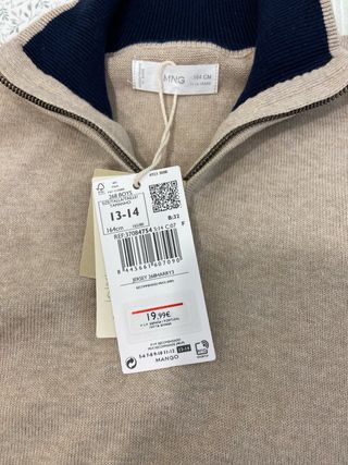 Jersey de punto para niño de la marca Mango, talla 13/14. Es un jersey nuevo con etiqueta. - Diseño con cuello alto y cremallera. - Color beige neutro. - Puños y bajo de canalé.