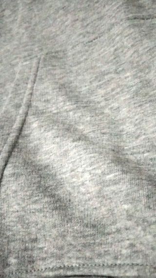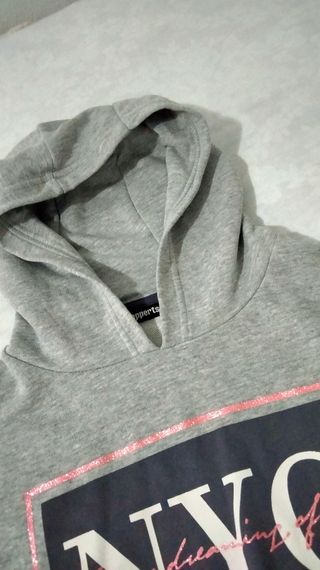 sudadera larga de manga y de largura, de color gris y con un bolsillo abierto. Tiene un dibujo en medio de la sudadera.