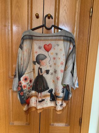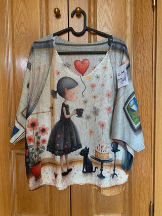 Jersey de punto con un tierno diseño de una niña tomando té con su gatito. - Estampado frontal con globos en forma de corazón, flores y un pastel de cumpleaños. - Mangas cortas y cuello en V. - Detalle de un marco con paisaje en las mangas. La marca es C.M. (no aparece en el buscador) y no da opción a dejarlo en blanco.