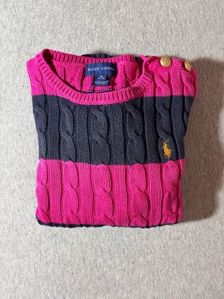 Jersey de punto trenzado con rayas en color rosa y azul marino. Presenta un pequeño logo bordado en amarillo en el pecho y botones dorados en el hombro. - Diseño de punto trenzado. - Cierre de botones en el hombro.