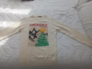 Jersey de punto con estampado navideño para niño. Presenta un diseño de montañas, árbol de Navidad y la frase SANTA CLAUS 2143KM.nuevo sin usar - Diseño festivo. - Manga larga.