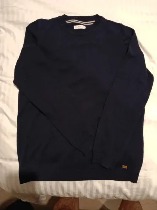 Jersey de punto azul para niño, en excelente estado. Uno sin estrenar - Diseño de cuello redondo. - Detalle de ribetes en el cuello. - Pequeña etiqueta decorativa en el bajo.