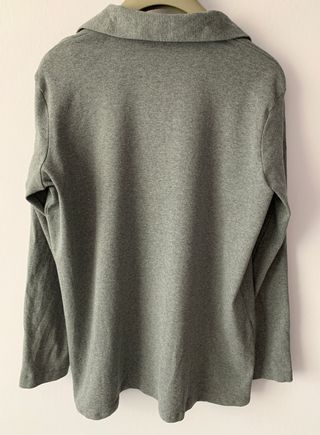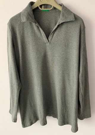 Jersey de manga larga con escote en pico Benetton para embarazada. Talla M. Color gris. Composición: 100% algodón. Diseño con cuello camisero y escote en V. Bien conservado. #mitmat #premama #benetton #sweater #camisa #jersey #camiseta