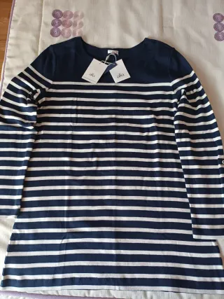 Jersey de rayas para premamá, cómodo y versátil. - Diseño de rayas horizontales. - Cuello en V. - Manga francesa con posibilidad de hacer más corta con un botón. - Laterales fruncidos. - Perfecto estado.