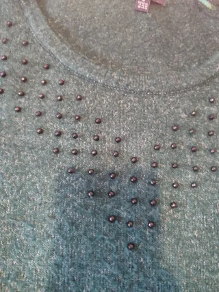 Jersey de punto gris, ideal para el embarazo. Presenta un bonito diseño con pedrería y cuentas en tono rosado y perma. - Manga larga. - Cuello redondo. - Adornos de pedrería y perlas.