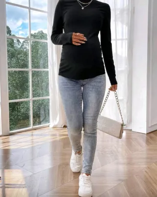 Jersey premamá fino y calentito, ideal para estar cómoda durante el embarazo. - Tejido acanalado. - Cuello alto con volante. - Manga larga.