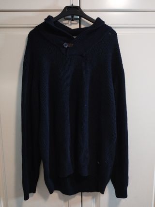 Jersey azul marino, en perfectas condiciones y usado muy pocas veces. Es bastante ancho para llevarlo holgado. Ideal para quedadas casuales.