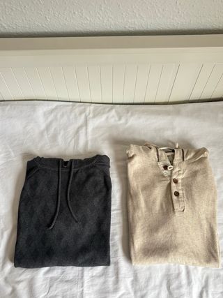 Dos jerséis con un diseño moderno y cómodo, perfectos para un estilo casual. - Jersey gris con estampado de rombos y cordones. De C&A talla L - Jersey beige con cuello de botones. De Pull&Bear talla M