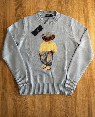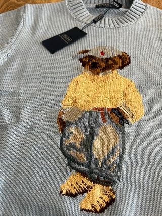 Jersey de punto de Polo Ralph Lauren con un diseño icónico, talla infantil 14/16 años que equivale a una S de mujer. - Detalle de oso de peluche con chaqueta y corbata. - Puños y cuello de canalé azul marino. - Iniciales RL bordadas en el bajo. Comprado por más del doble de lo que lo vendo.
